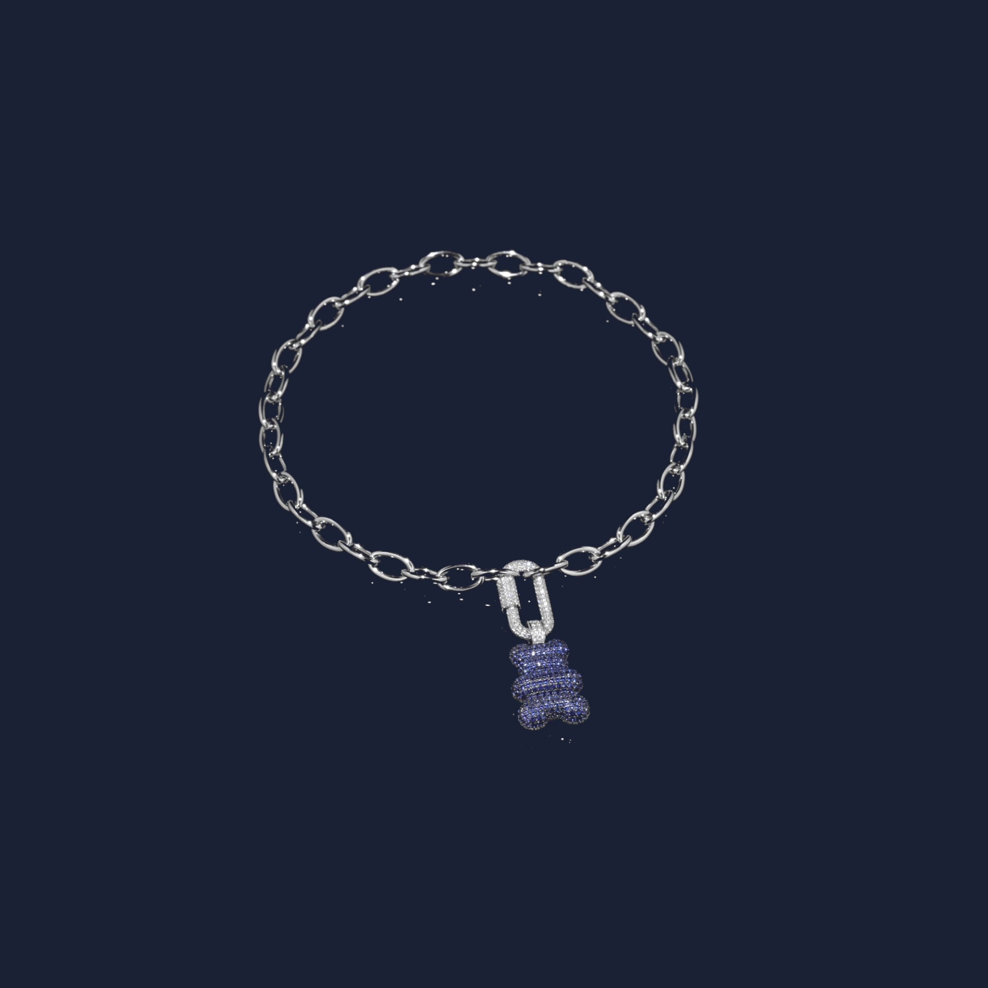 Bracelets APM Monaco: stretch beaded bracelet in silver-tone beads with two bone-shaped pendants, a blue pendant on the chain and a white pendant that dangles.Bracelet with a blue yummy bear gemstone worn on a wrist, with a green garment in the background