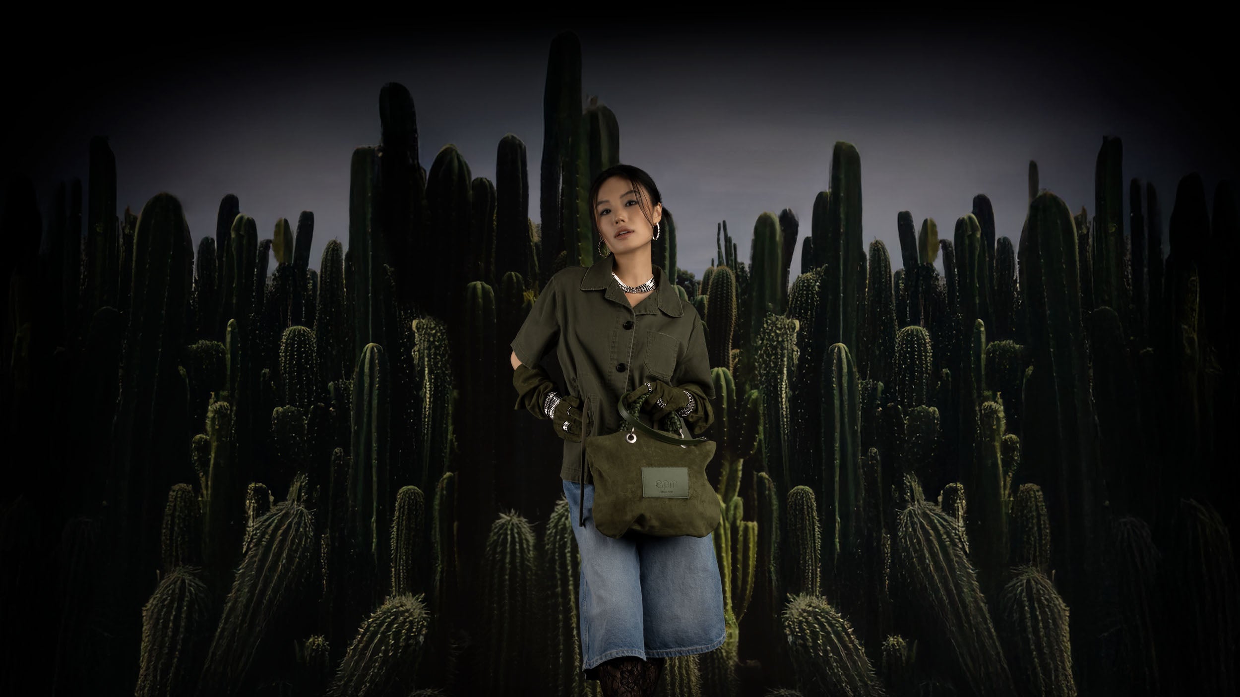 Green handbag with braided handle on a white backgroundModel holding a green bag in a cactus-filled landscape