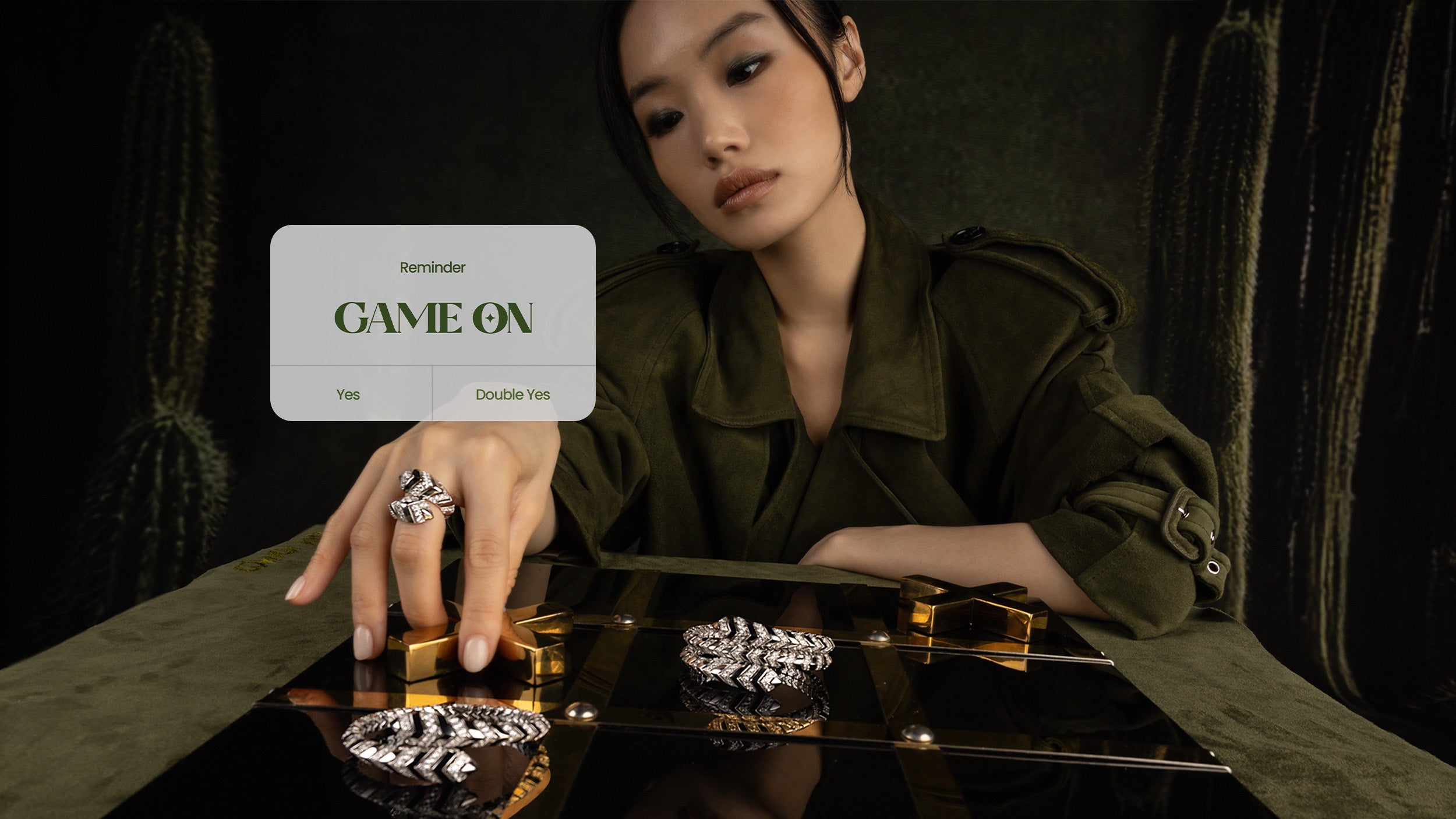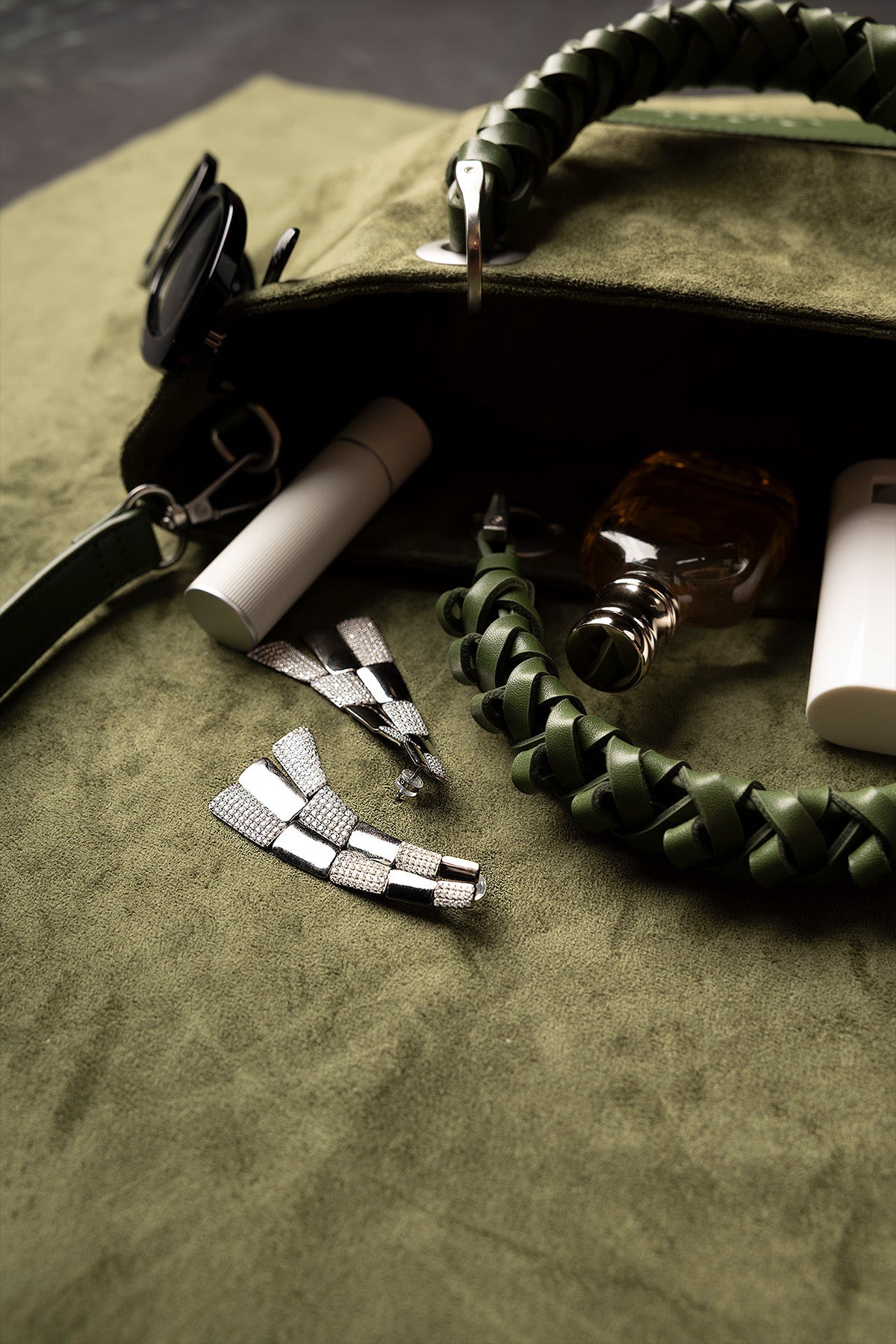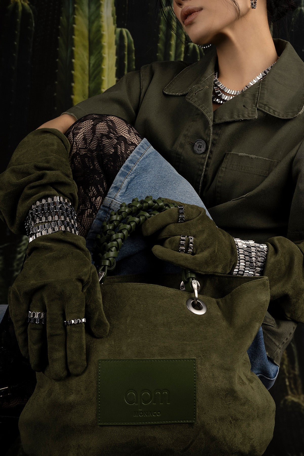 Green handbag with decorative handle on a white backgroundModel holding a green suede handbag with cacti in the background