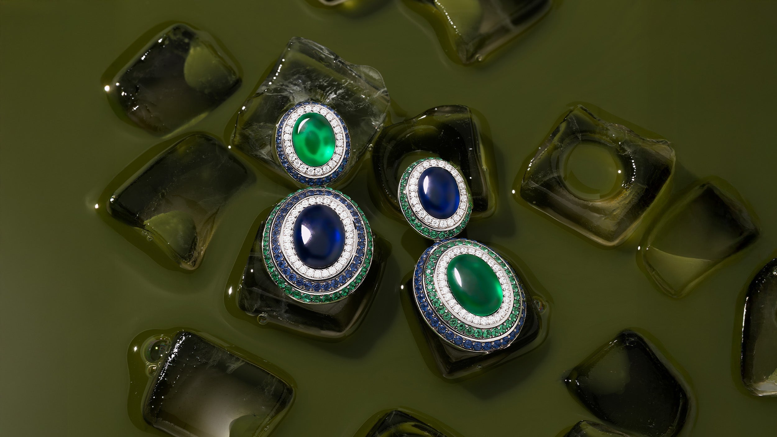 Pair of earrings with green and blue stones on a white backgroundClose-up of a model wearing a earring with green and blue gemstones.
