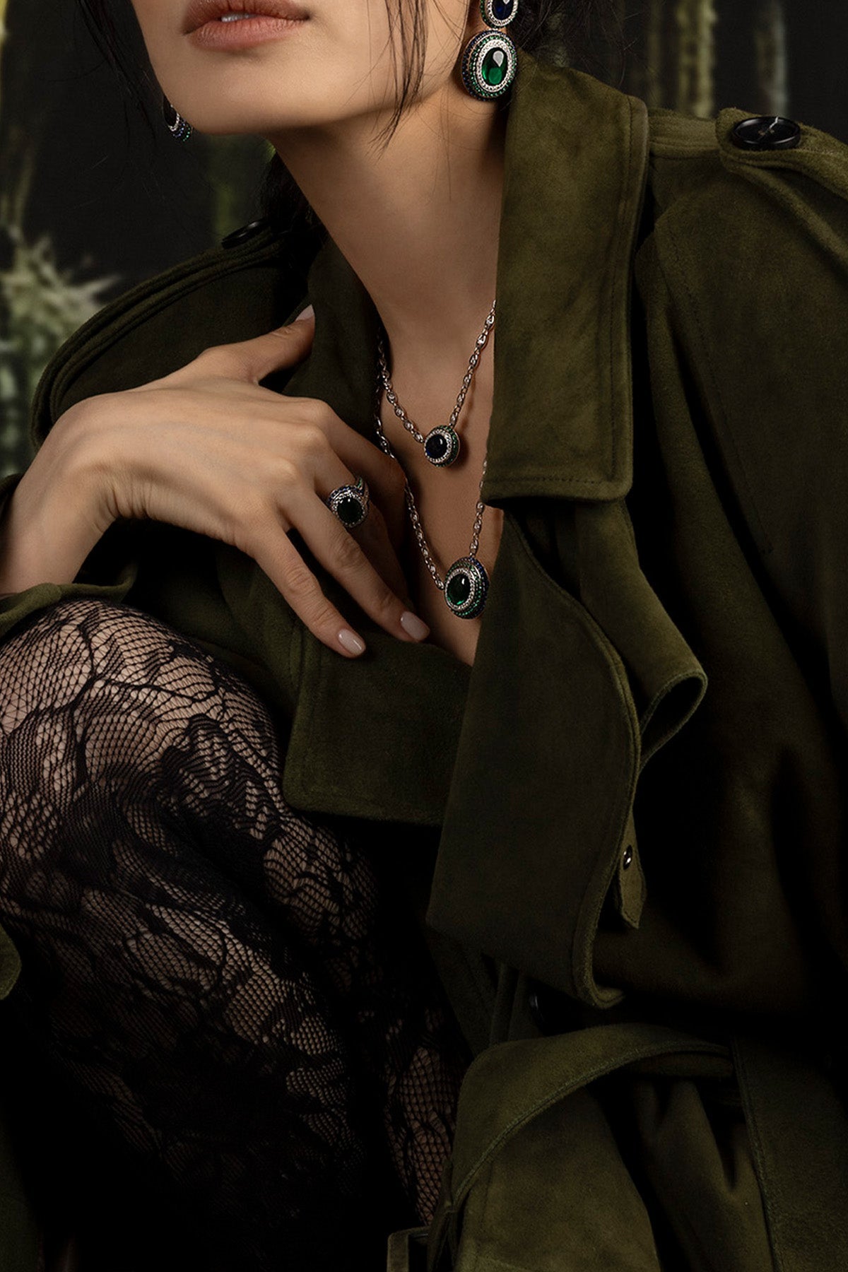 Bracelet with green and blue stones on a white backgroundClose-up of a person wearing a bracelet with green and blue stones on an olive green coat.