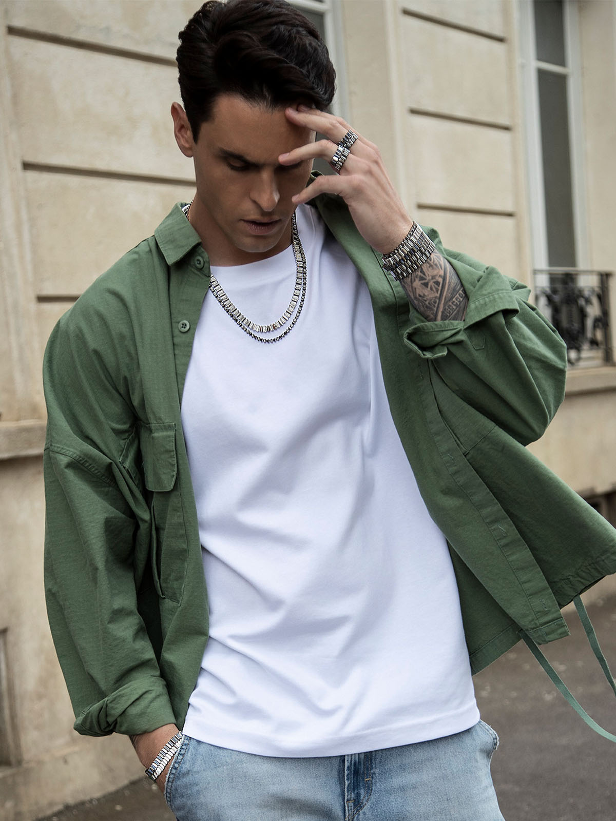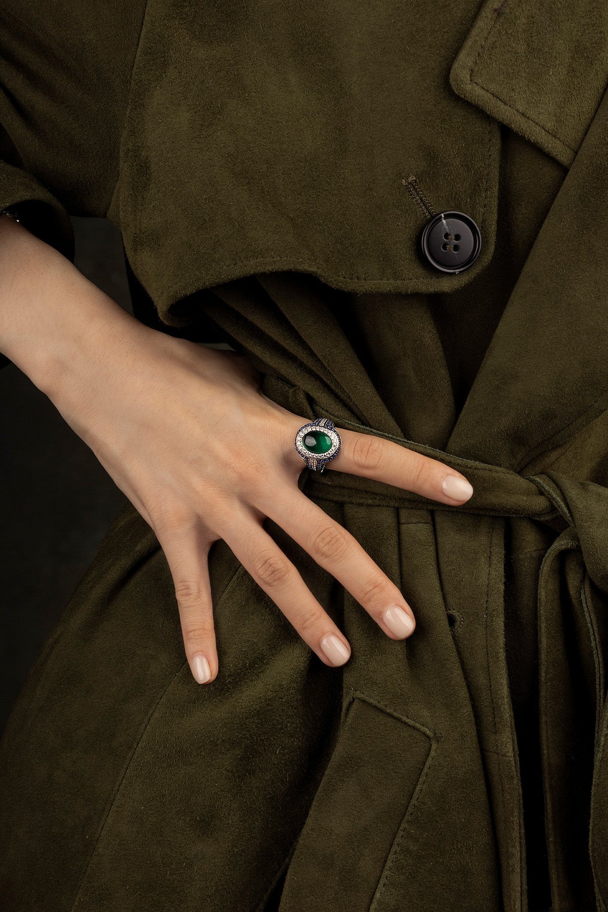Silver ring on a light grey backgroundHand wearing a silver ring with a dark green coat