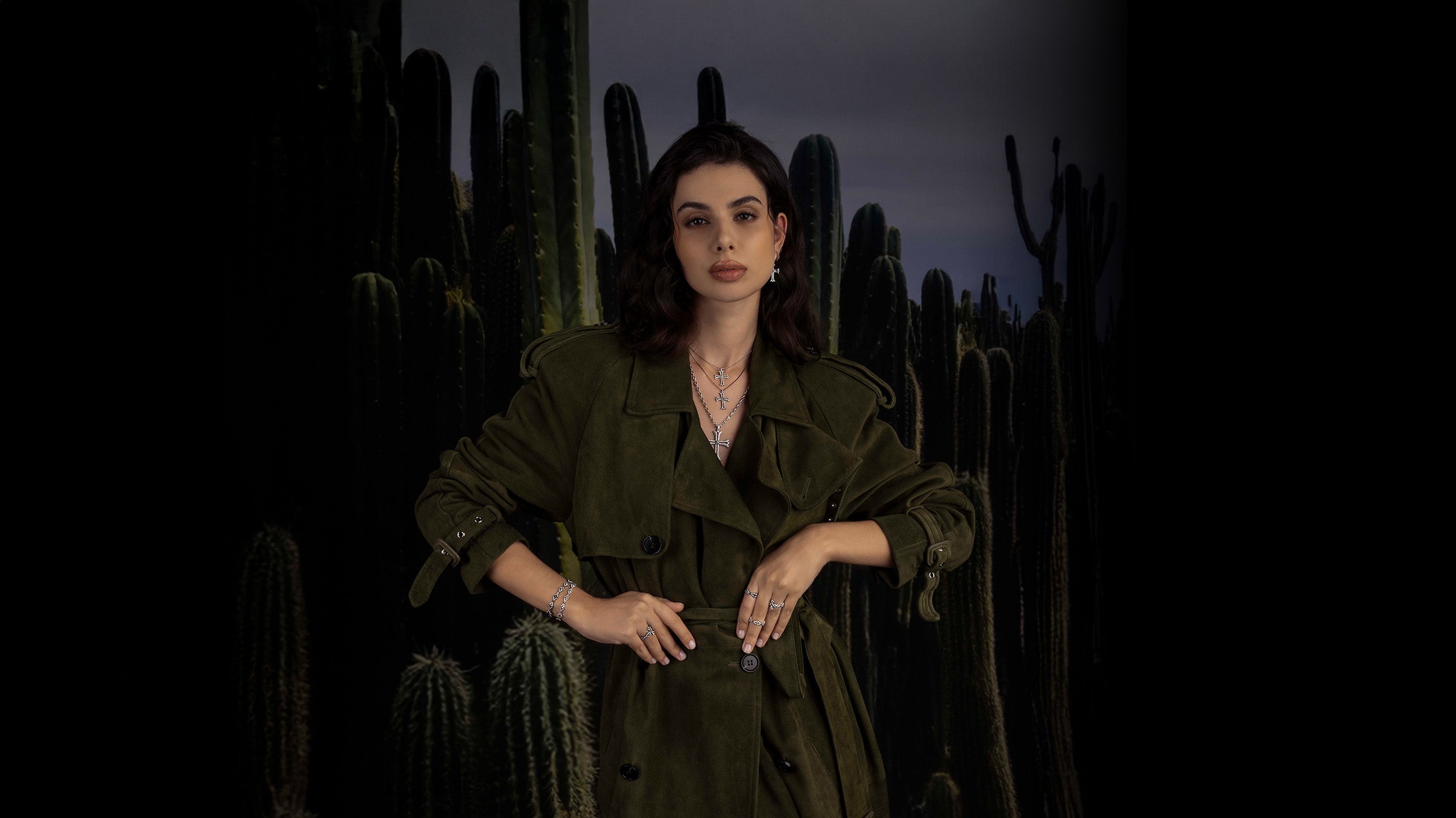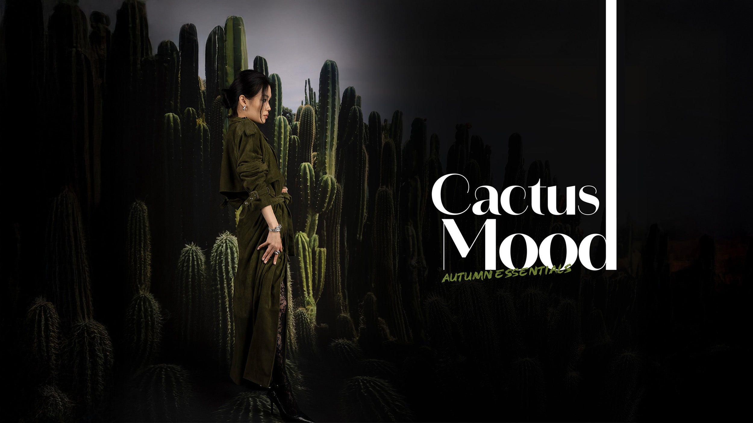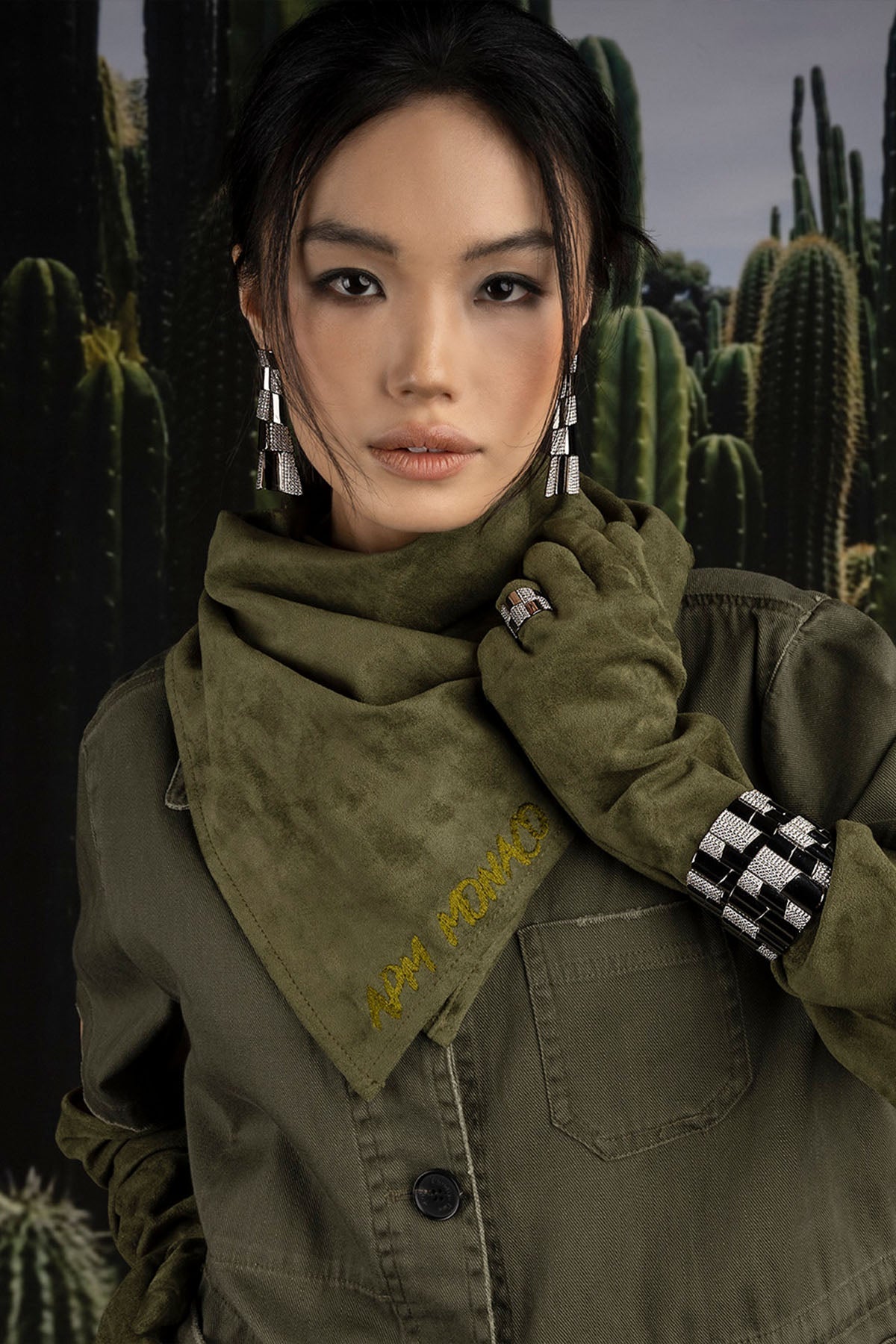 Dark green fabric swatch with on a light grey backgroundModel wearing a green jacket and scarf with cactus background