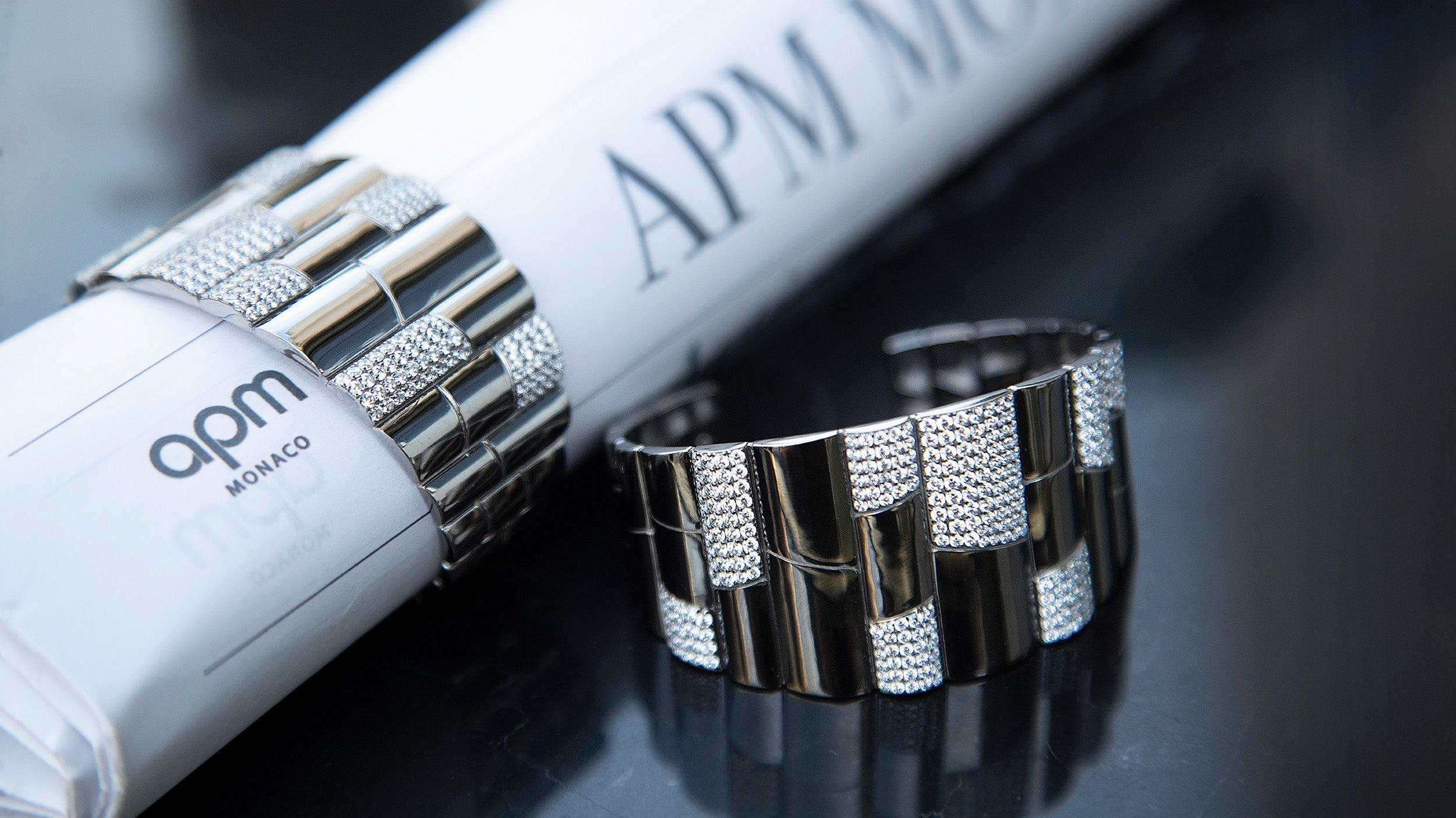 Silver bangle with white stones on a white backgroundAPM Monaco Pavé Bracelet in silver on a person's wrist