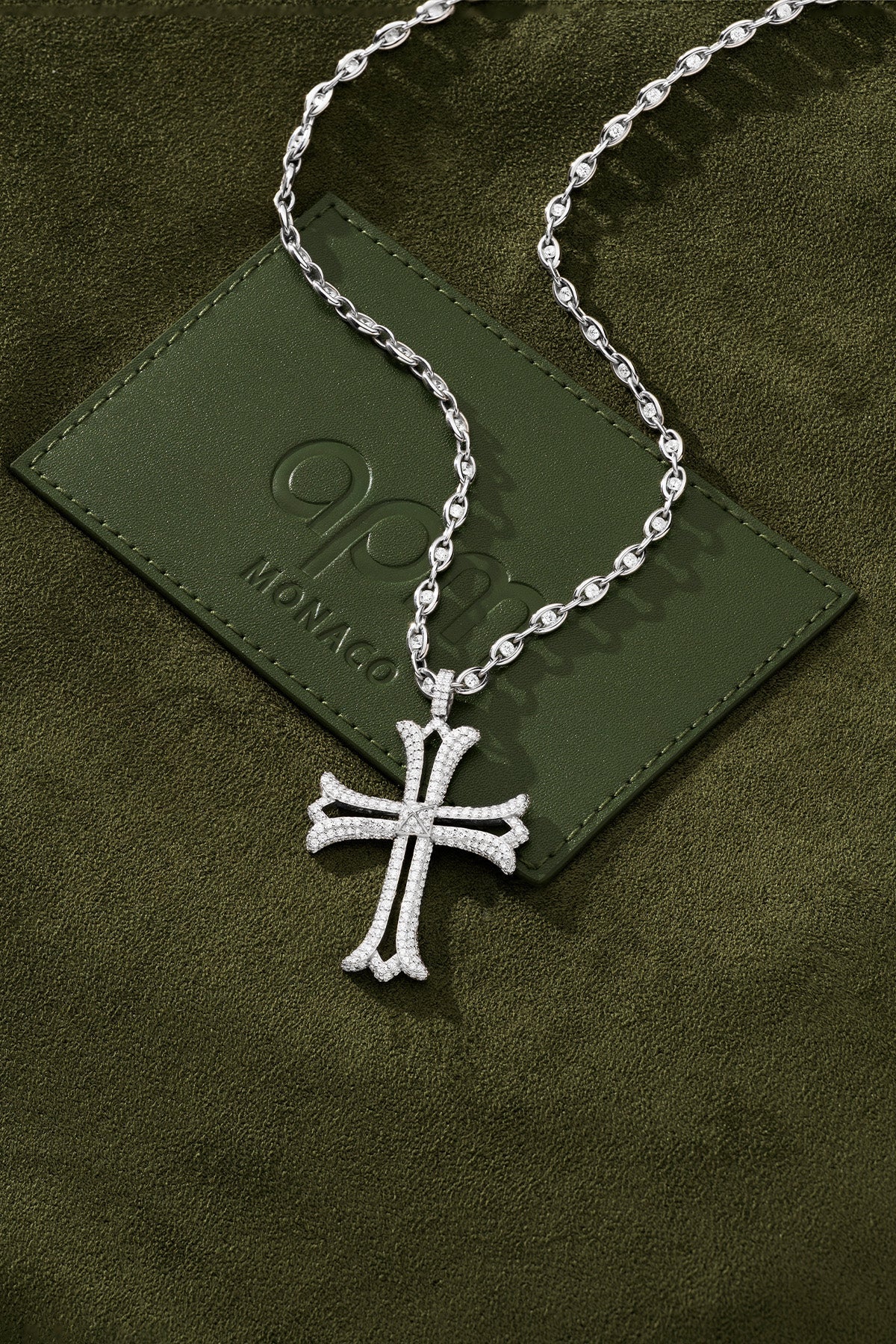 Silver cross pendant necklace on a white backgroundSilver cross necklace on a model wearing a green jacket