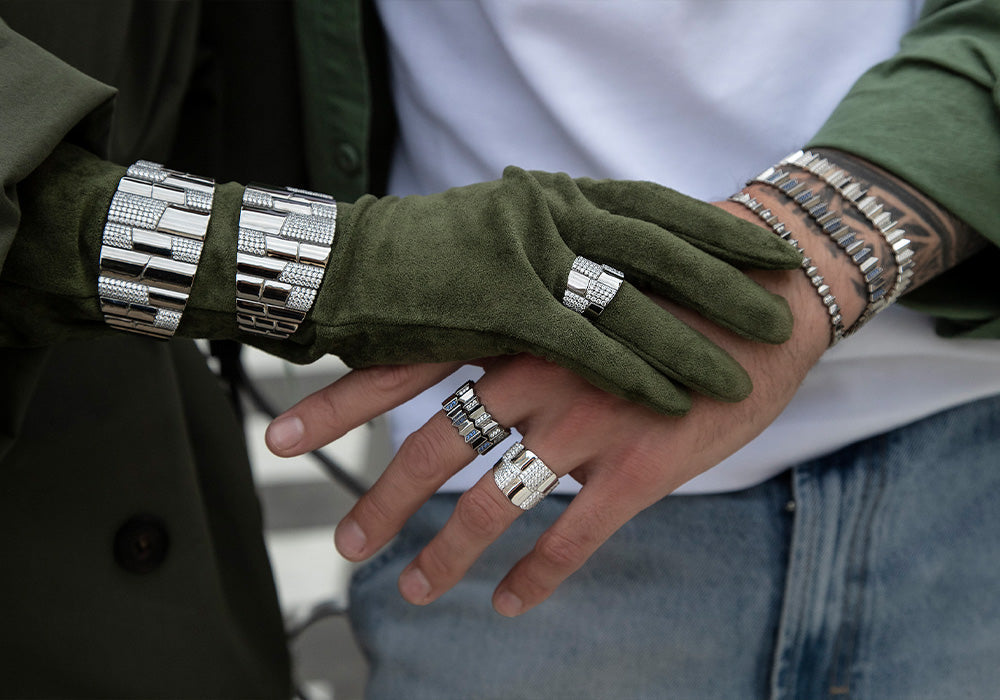 Dark grey silver bracelet with geometric design on a white backgroundAPM MONACO up and down bracelet in silver on a wrist with a dark khaki coat in the background