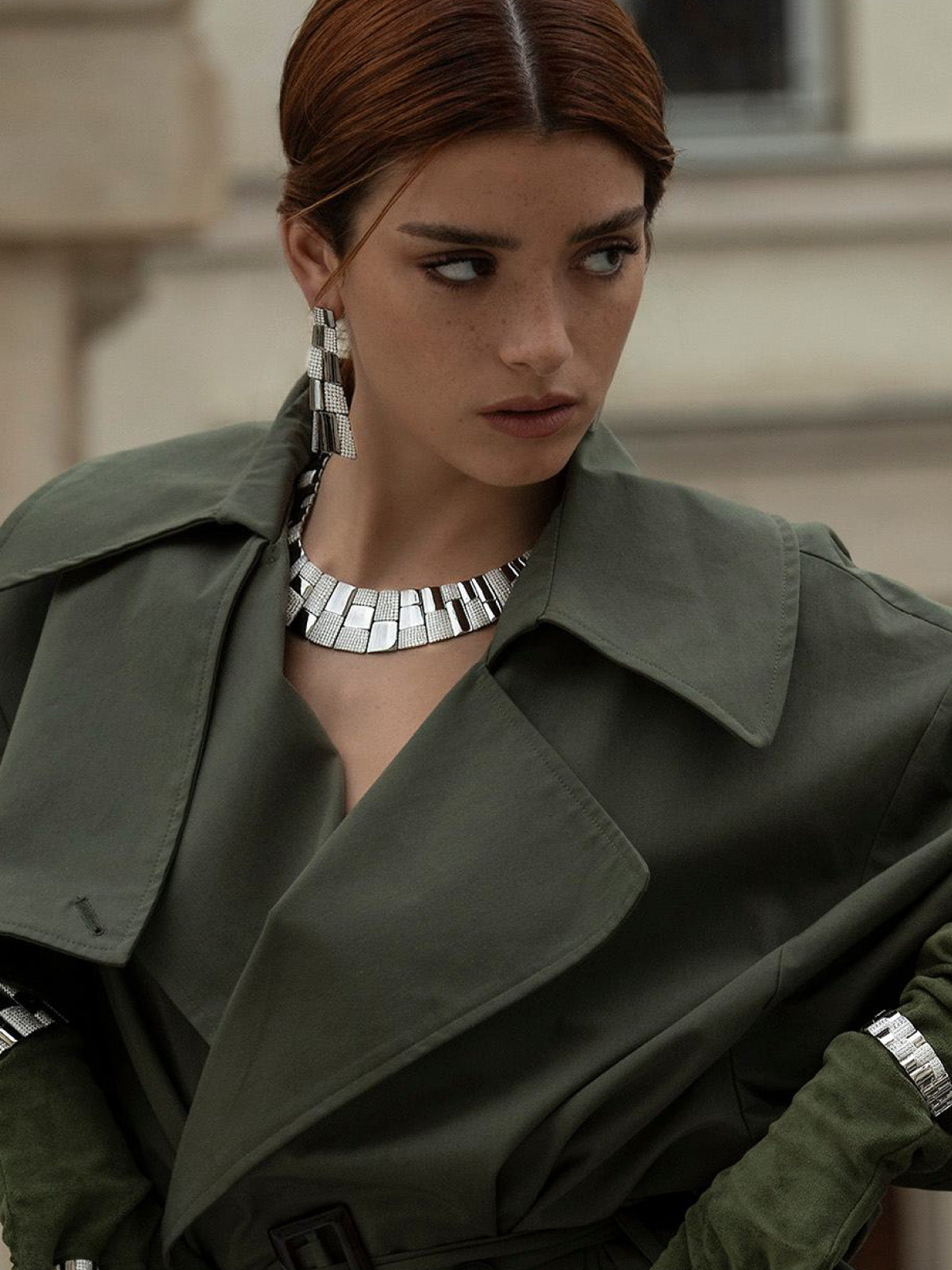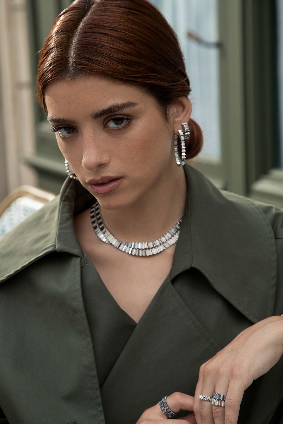 Silver necklace on a white backgroundClose-up of a model wearing a necklace and earrings with a blurred background