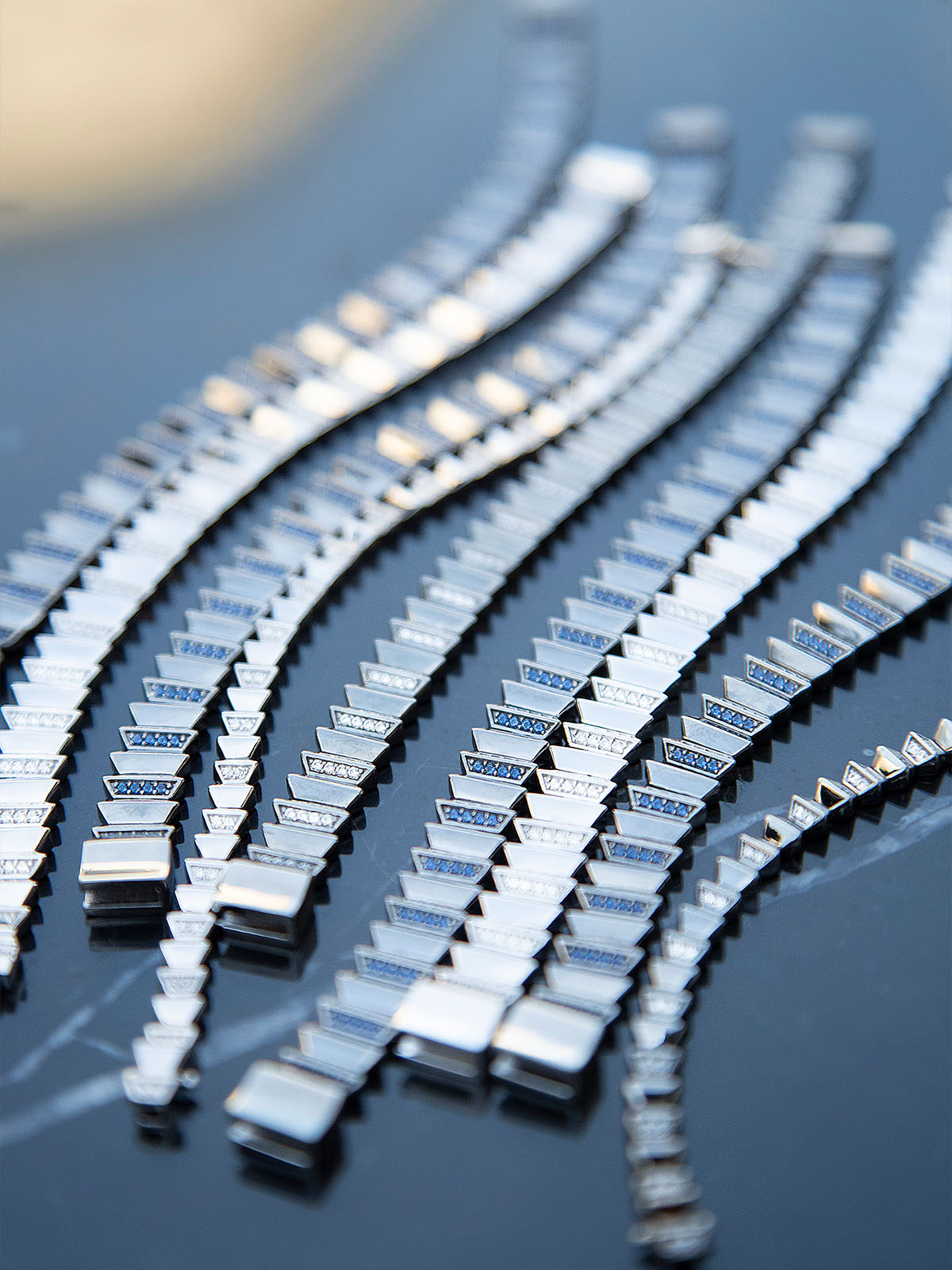 Bracelet with geometric design and blue stones on a white backgroundSilver bracelet on a person's wrist with a dark green coat