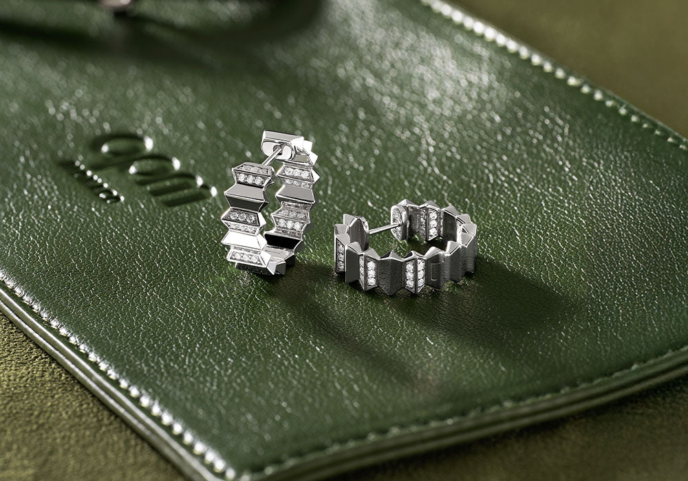 Pair of geometric hoop earrings on a white backgroundClose-up of a model wearing hoop earrings, green gloves, and sunglasses.