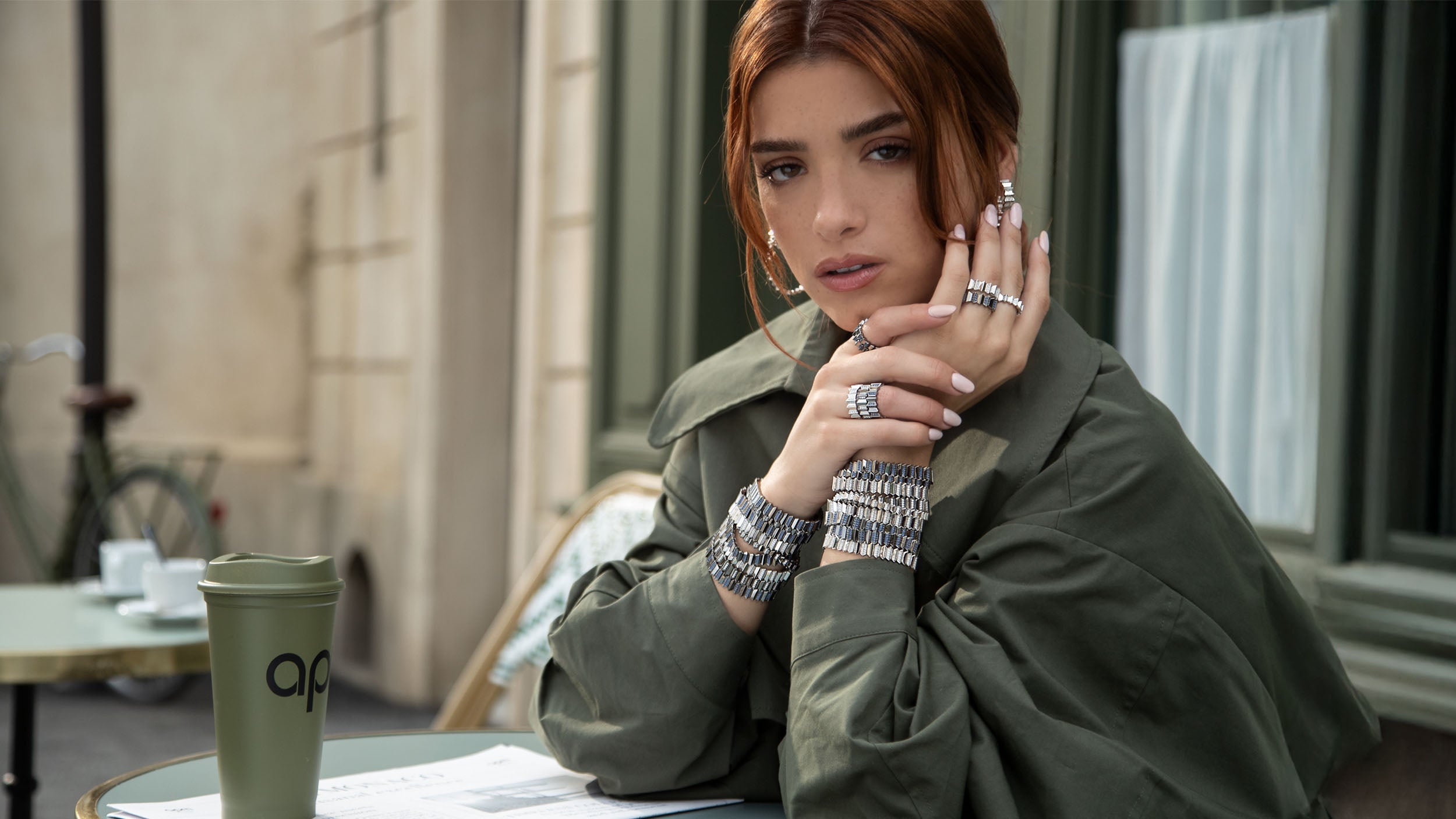Silver ring on a white backgroundClose-up of a hand wearing a APM Monaco Kaa Ring in silver with a green coat in the background