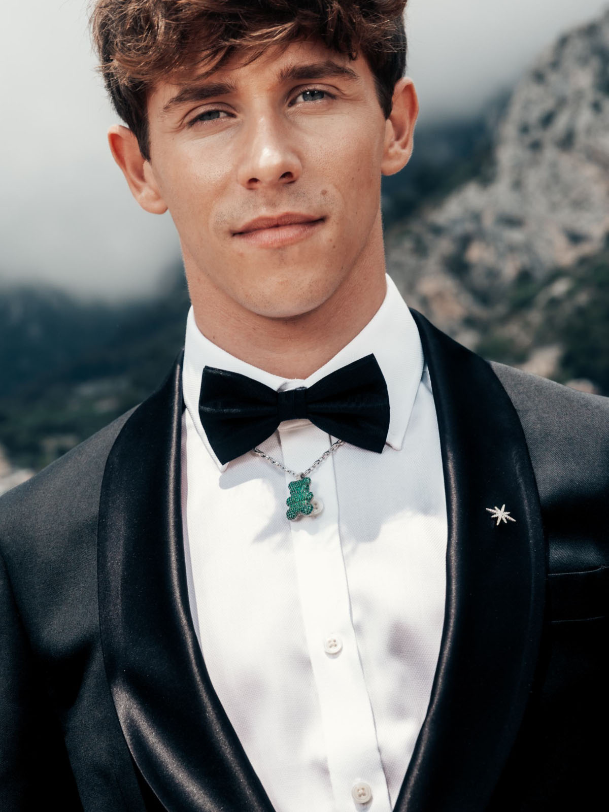 Two men in formal attire standing against a red background with APM MONACO jewelry