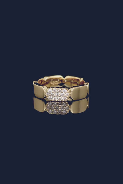 This ring is made with APM Alloy and 18k yellow gold plated. It is microset with white cubic zirconia.