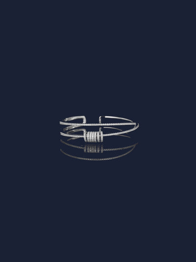 独創的な7つのスライディングリングがデザインされたオープンカフ。スタイルに洗練されたアクセントを加えるユニークなジュエリーです。