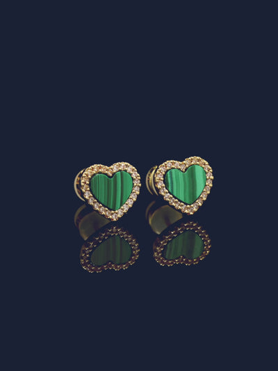 APM Yellow Alloyと3ミクロンの18Kゴールドプレートレイヤーで仕上げたピアス。ホワイト キュービックジルコニアのマイクロセッティングが施され、マラカイトがあしらわれています。