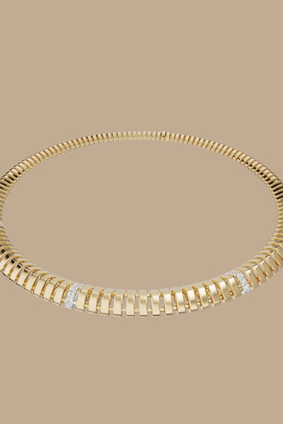 太陽をイメージし、あたたかなゴールドトーンの光を象徴したチョーカー。パヴェディテールが美しくきらめき、あらゆるルックを引き立てます。 南フランスの絵のように美しい遊歩道に立ち並ぶヤシの葉にインスピレーションを得てデザインされています。