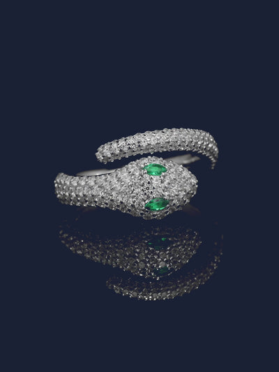 APMのアイコニックなサーペントがエレガントに指を彩る精巧なリング。グリーンのカラーアクセントがポイント。重ね着けでも引き立ちます。