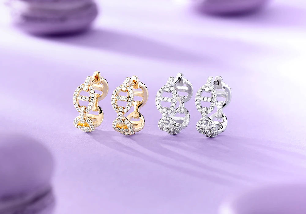 キカ・プレッテが情熱を込めてデザインするAPMモナコのジュエリー。いずれのアイテムも、クラフツマンシップと現代的なスタイルにこだわって実現されています。 あらゆるイヤリング製品は、自社でデザインされています。南フランスのシックなライフスタイルをイメージしたアイテムには、フランスならではのクラシックなデザインとトレンディスタイルが巧みに折衷されています。 メゾン流のアプローチで、洗練されたデザインに昇華されたイヤリングコレクションは、スターリングシルバーと18Kゴールドめっきを使用して実現されています。 パヴェは、APMのシグネチャーイヤリングに広く用いられているデザインです。ダイヤモンドイヤリングには、ラボで開発されたダイヤモンドが使用され、スタッドタイプとハギーフープイヤリングで展開されています。