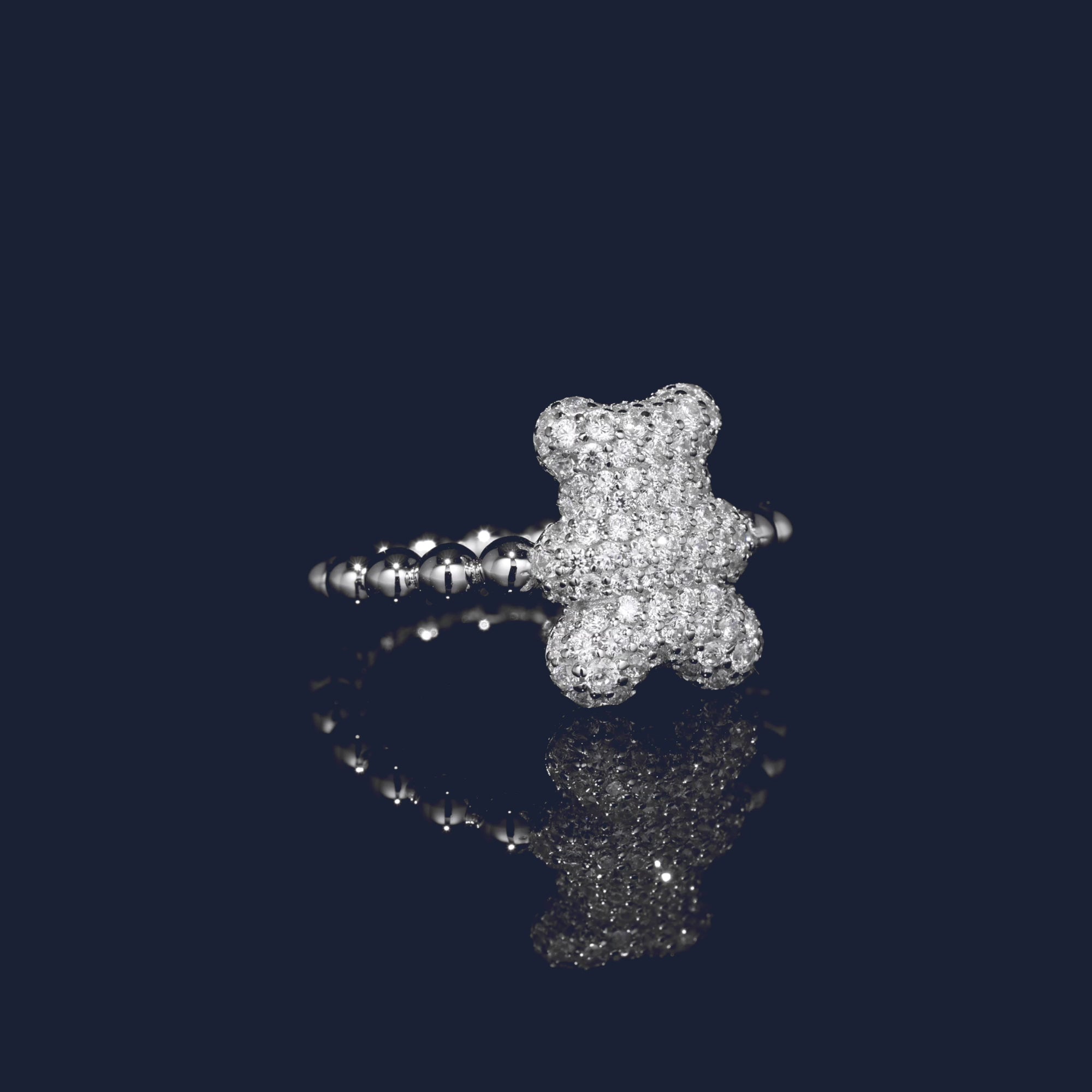 手作業で仕上げたスターリングシルバー製のリング。Yummy Bearにホワイト キュービックジルコニアのマイクロセッティングが施されています。