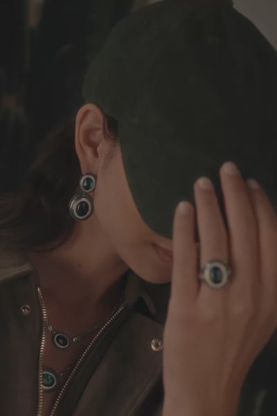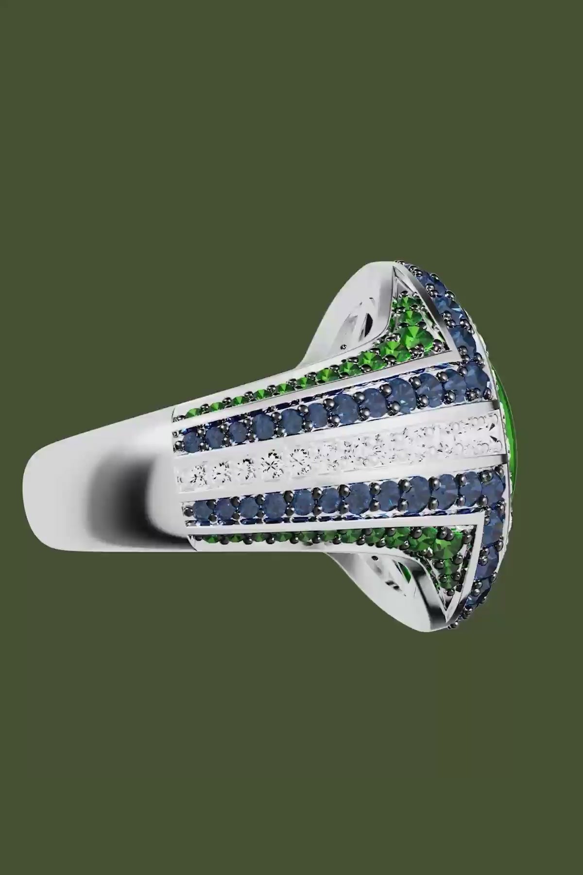 グリーンとサファイアブルーの鮮やかなストーンをあしらった魅惑のパヴェリング。洗練性とエッジーなデザインが美しく折衷されています。 光が通るようストーンをセッティングすることで、まばゆい輝きを放ちます。