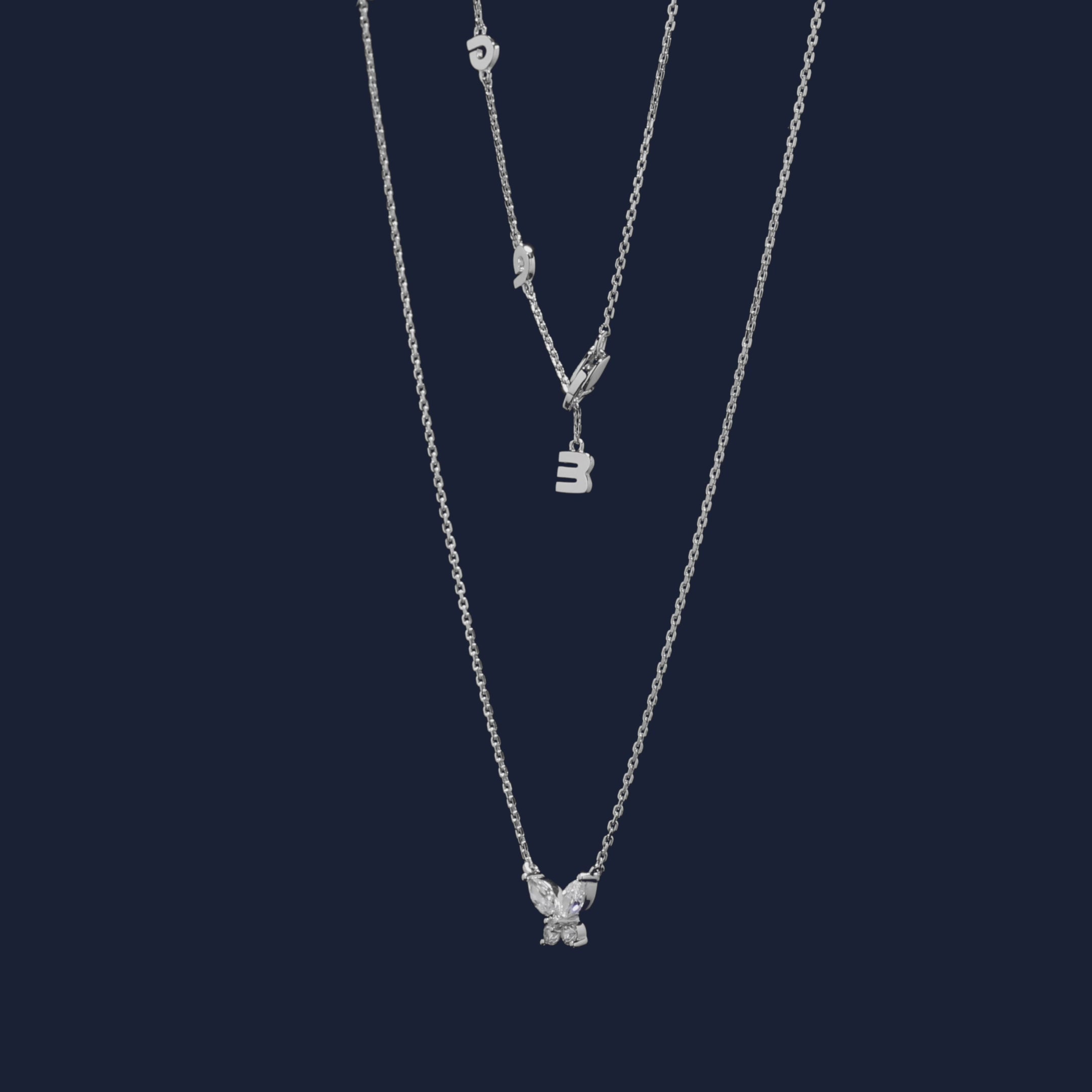 スターリングシルバーとホワイトジルコニアストーンで仕上げたネックレス。長さの調整は3段階があります。a, pかmの3文字のどちらかの間に留めることにより長さの調整が可能になります。