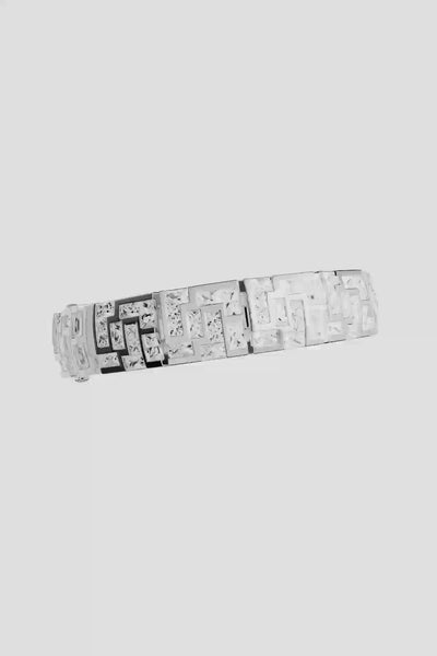 スターリングシルバーが輝くストーンの小径と交わり、光と影が織りなす小さな割れた氷 を描き出します。