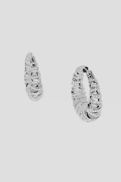 プレーンなスターリングシルバーと全面パヴェが重なり合い、質感と輝きが調和するエレガントな融合を生み出します。 多様なスタイルに寄り添うデザインで、洗練とモダンな魅力を兼ね備えたピアスです。