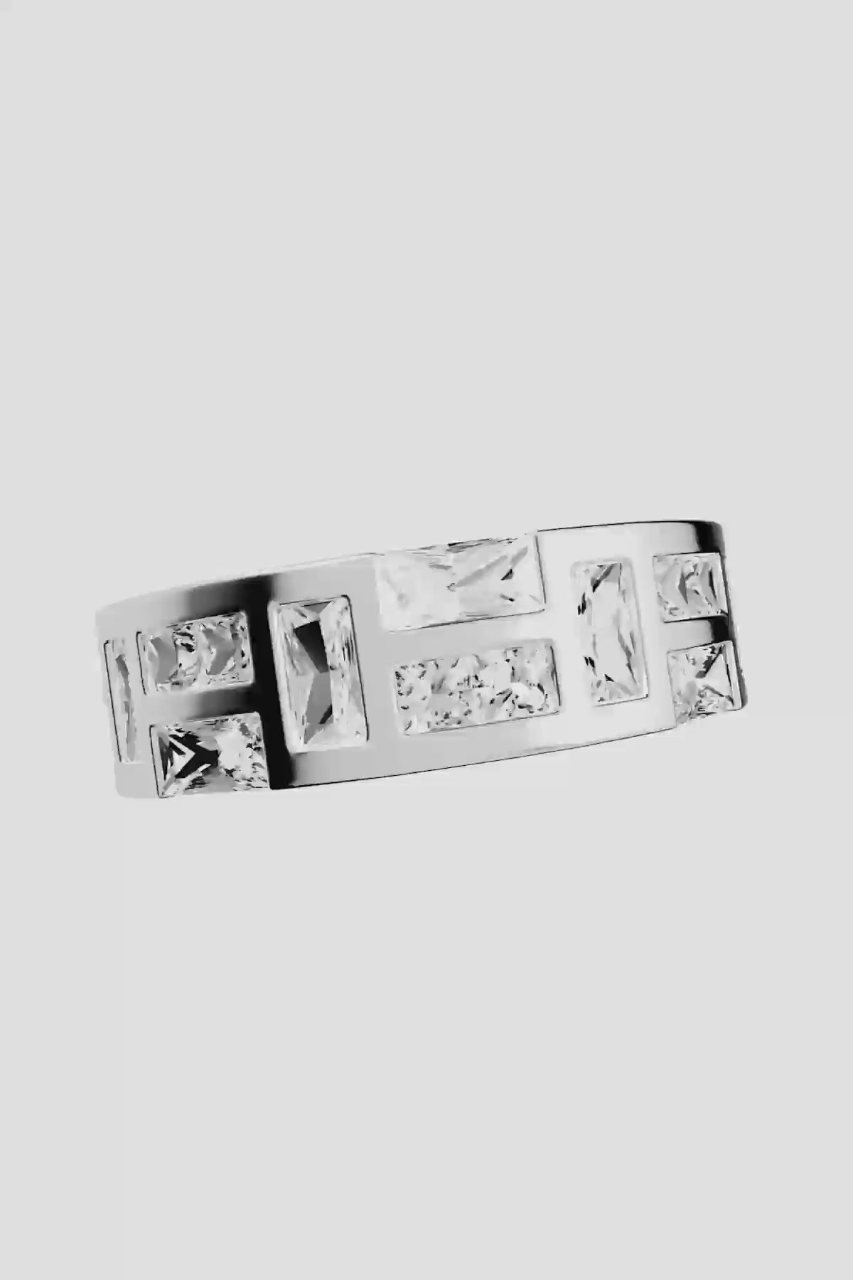 スターリングシルバーが輝くストーンの小径と交わり、光と影が織りなす小さな割れた氷 を描き出します。