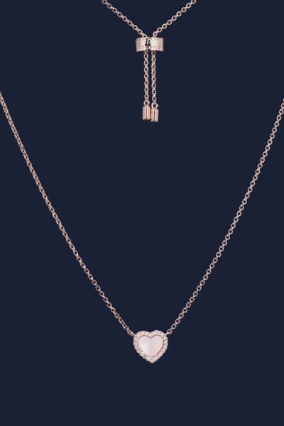 APM Rose Alloyと3ミクロンの18Kゴールドプレートレイヤーで仕上げたネックレス。ホワイトジルコニアのマイクロセッティングが施され、ピンクマザーオブパールがあしらわれています。