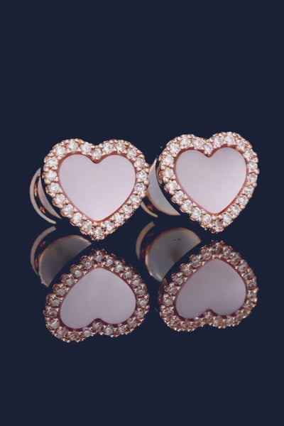 APM Rose Alloyと3ミクロンの18Kゴールドプレートレイヤーで仕上げたピアス。ホワイトジルコニアのマイクロセッティングが施され、ピンクマザーオブパールがあしらわれています。