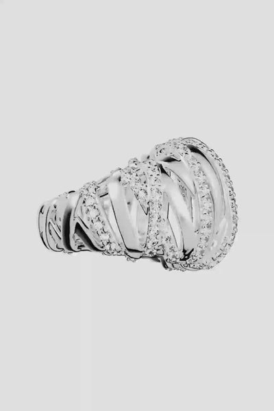 プレーンなスターリングシルバーと全面パヴェが重なり合い、質感と輝きが調和するエレガントな融合を生み出します。 多様なスタイルに寄り添うデザインで、洗練とモダンな魅力を兼ね備えたリングです。