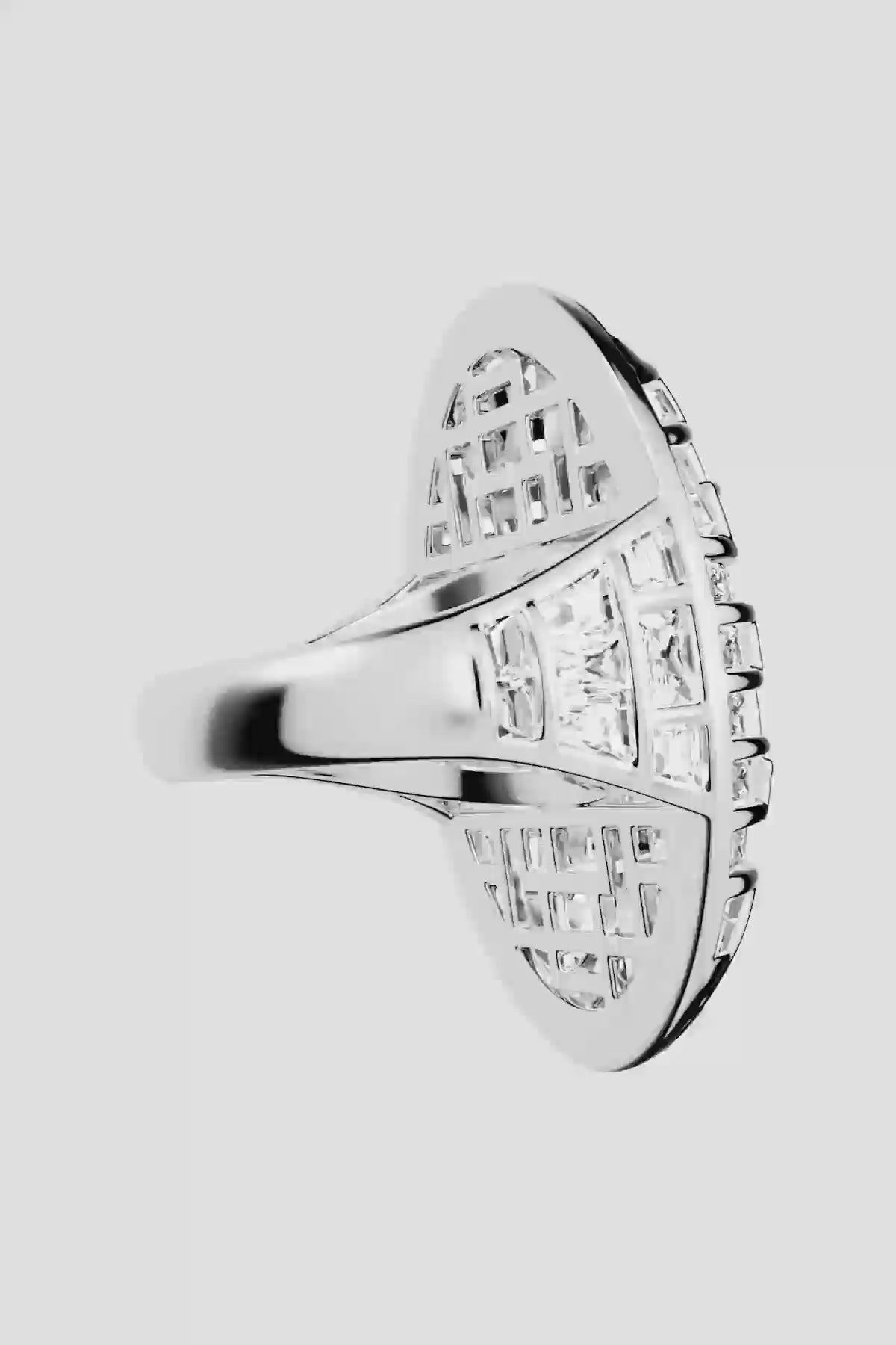 スターリングシルバーが輝くストーンの小径と交わり、光と影が織りなす小さな割れた氷 を描き出します。