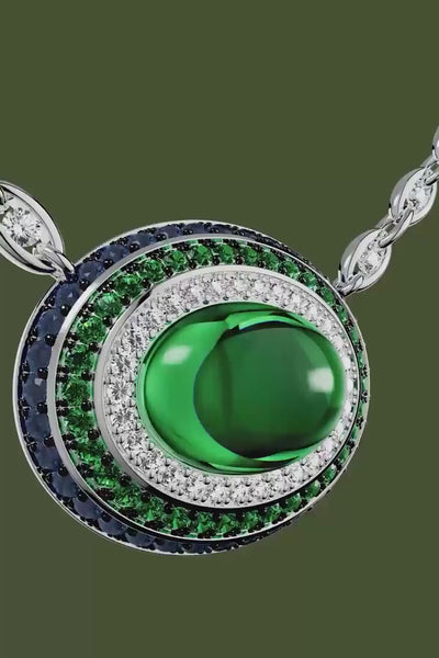 This captivating piece pavé with vibrant green and sapphire-blue stones blends sophistication and edgy aesthetic. The setting technique on the chain gives the stones a refined floating effect and the light shines through.