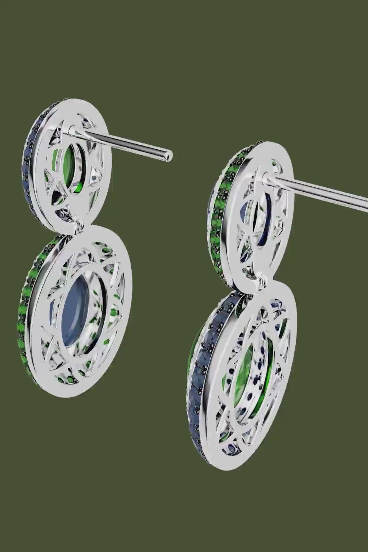 These captivating pieces pavé with vibrant green and sapphire-blue stones blend sophistication and edgy aesthetic. The light shines through, creating a radiant effect.