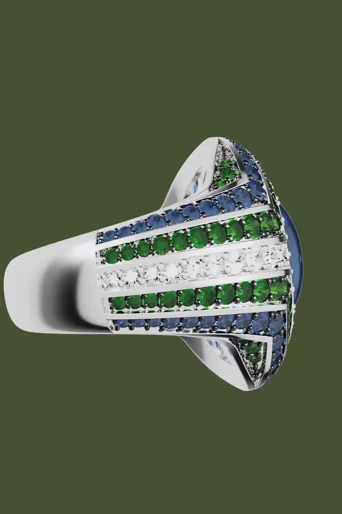 This captivating piece pavé with vibrant green and sapphire-blue stones blends sophistication and edgy aesthetic. The light shines through, creating a radiant effect.